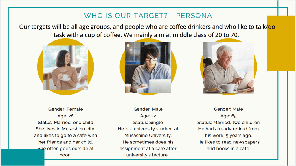 I have considered persona for a new cafe to clarify our target audience. Our target will be all age groups, and people who love coffee and who like to do tasks/talk with a cup of coffee. We mainly aim at the middle class of 20 to 70.