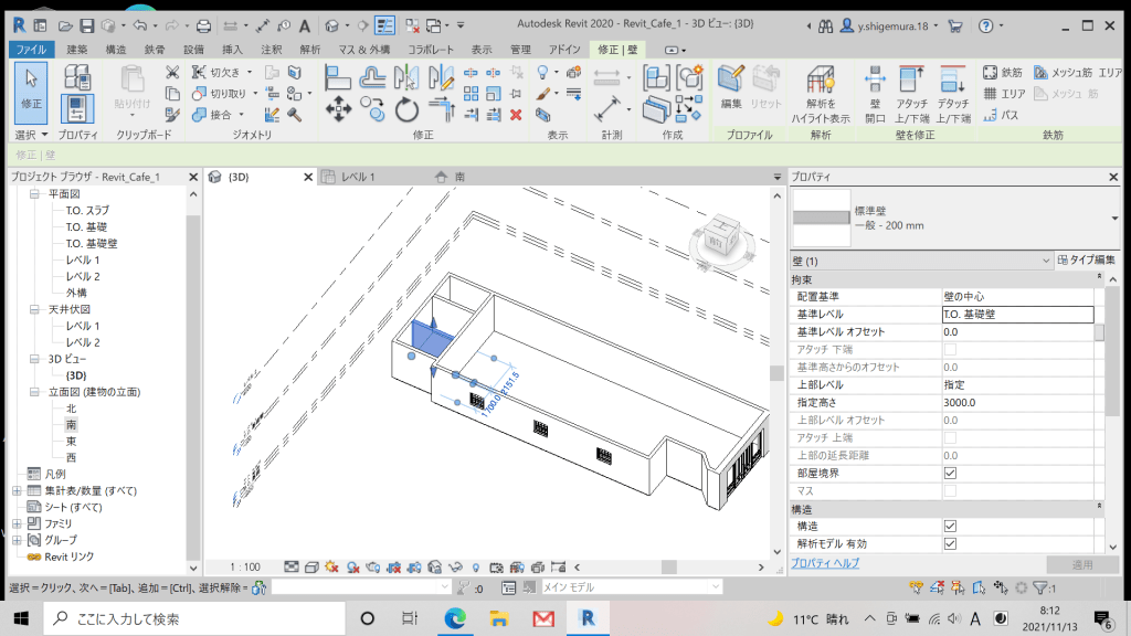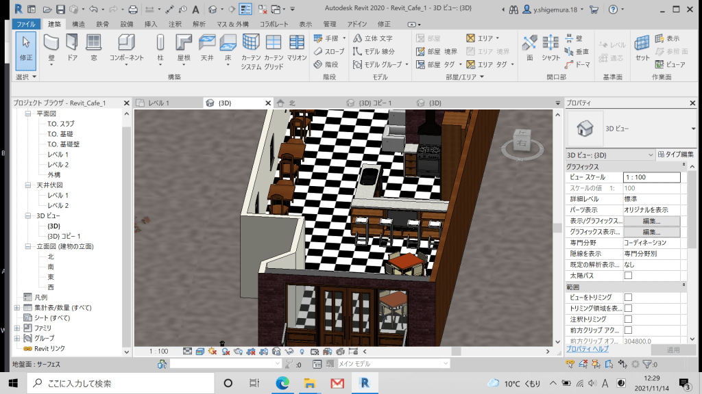 I began with creating a new Revit project and the design drawing was imported to the project on Autodesk Revit. At first, I was creating the floor and walls, entrance and windows. I also downloaded the asset family such as kitchen and dining tables. Each object was placed by considering the effective use of space for the cafe.