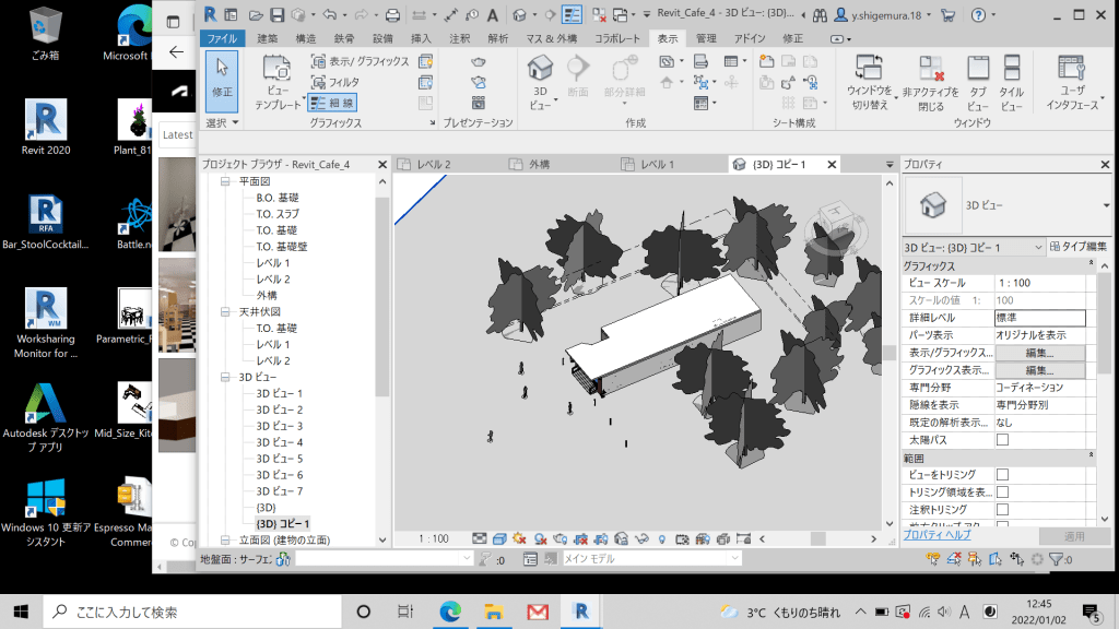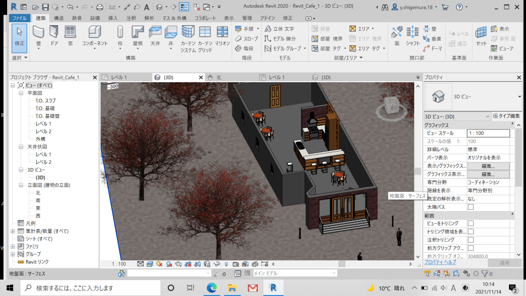 I continued creating a 3D cafe model on Revit in week 7. I have begun by adding outside assets such as trees and people. It allowed making the 3D view more real.