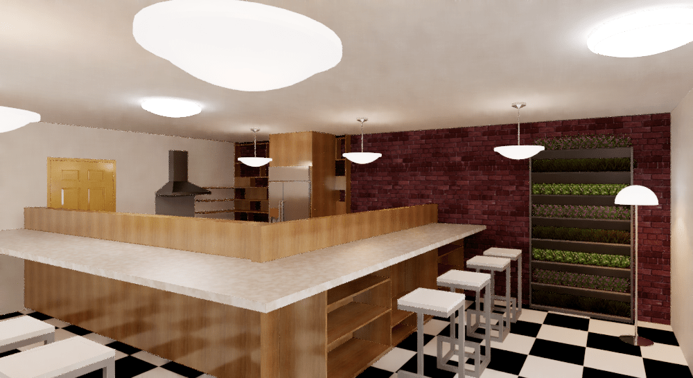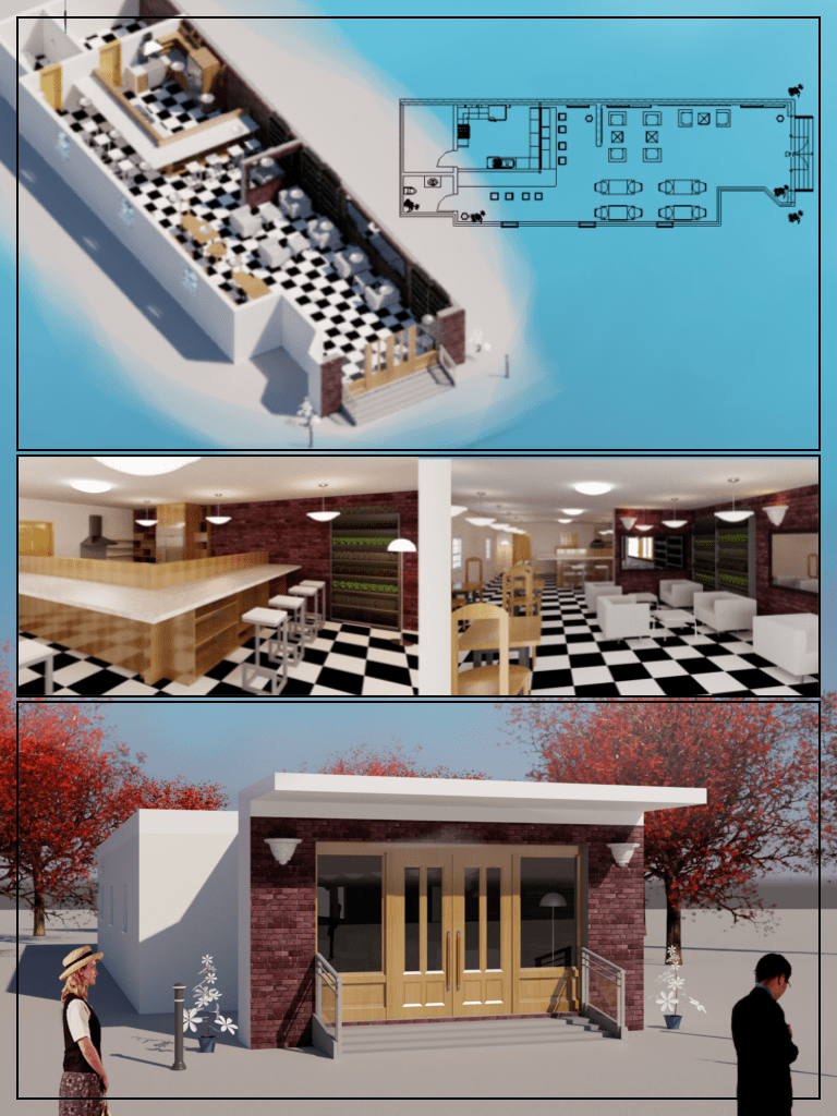 The main purpose of this project is to understand how professionals work in the industry that students are interested in through work placement or client projects. My client project was to create a 3D model of a new café. It is included from sketch concepts to making it into 3D. The opportunity is to engage pipeline for arch vis. The objective is to design an attractive cafe&bar and share 3D images among designers, builders, and owners.