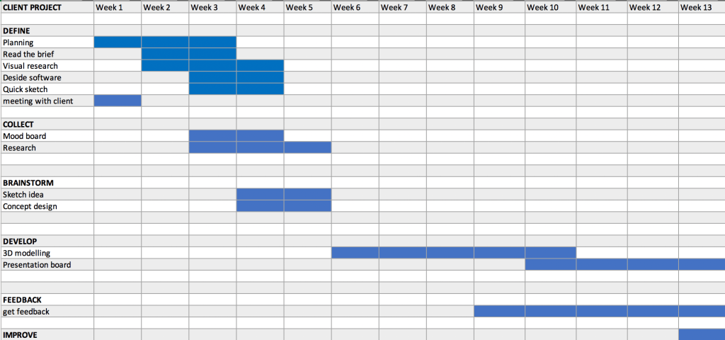 At the beginning of the project, we had an online meeting with a client through Zoom. We had discussed the detail of the project and the time plan. After the meeting, I have created a Gantt Chart which have been broken the task into small categories by Design Process. Although the deadline is by the end of this year I decided to finish at the same time as the end of the semester. That is why the Gantt chart show from week 1 to week 13.