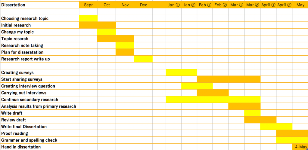 I have created a Gantt Chart for my dissertation. The final deadline is 4th of May in Semester 2.